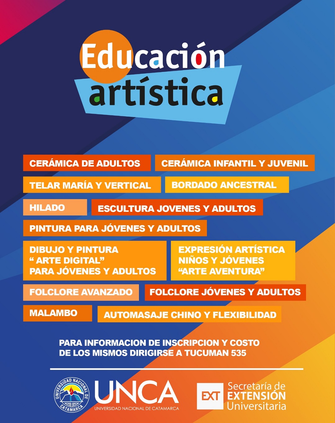 La Secretaría de Extensión Universitaria de la UNCA, a través de su área de Cultura, dio inicio a un nuevo ciclo de talleres abiertos a la comunidad. La propuesta incluye una variada oferta destinada a diferentes edades e intereses, entre los que se destacan: cerámica para adultos, escultura para jóvenes y adultos, telar maría y telar vertical, hilado, bordado, arte para niños a partir de los 10 años, folklore inicial para jóvenes y adultos y ballet folclórico tanto juvenil como infantil.