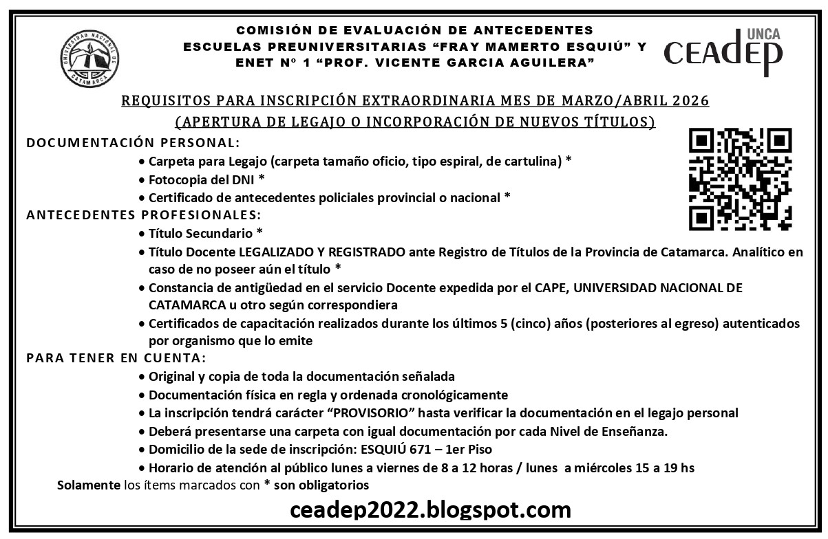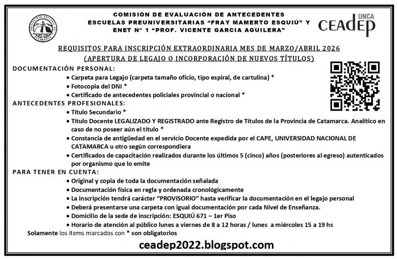 La Comisión de Evaluación de Antecedentes de Escuelas Preuniversitarias (CEADEP) dependiente de Secretaría Académica de UNCA, inició el proceso de Inscripción Extraordinaria de aspirantes a Interinatos y Suplencias en Cargos Docentes y Horas de Cátedras en las Escuelas Preuniversitarias "Fray Mamerto Esquiú" y ENET N°1 "Prof. Vicente García Aguilera".