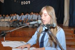 Luego en nombre de los egresados se dirigió a los presentes la alumna del 3º Año "A" Paula Juliana Savio quién manifestó que "hoy se mezclan las emociones, los estados de ánimos. Pero lamentablemente aquí y ahora terminamos con ese camino que caminamos juntos desde el principio. Tantos recuerdos que guardaremos en los más profundo, como los más preciado dentro nuestro".