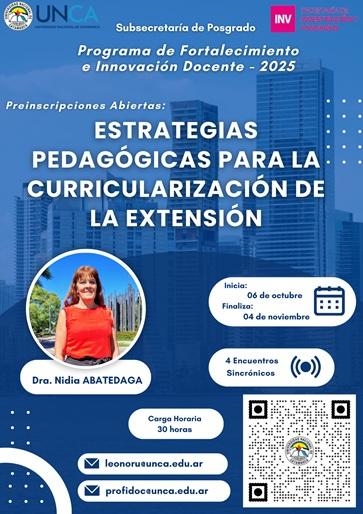 El curso de posgrado, será dictado por las Dra. Nidia C. ABATEDAGA, está dirigido a docentes investigadores, estudiantes de posgrado de la mencionada casa de estudios, este espacio formativo busca fortalecer las prácticas docentes y profesionalizantes mediante la incorporación de contenidos y estrategias extensionistas, promoviendo el diálogo de saberes entre la universidad y la sociedad.