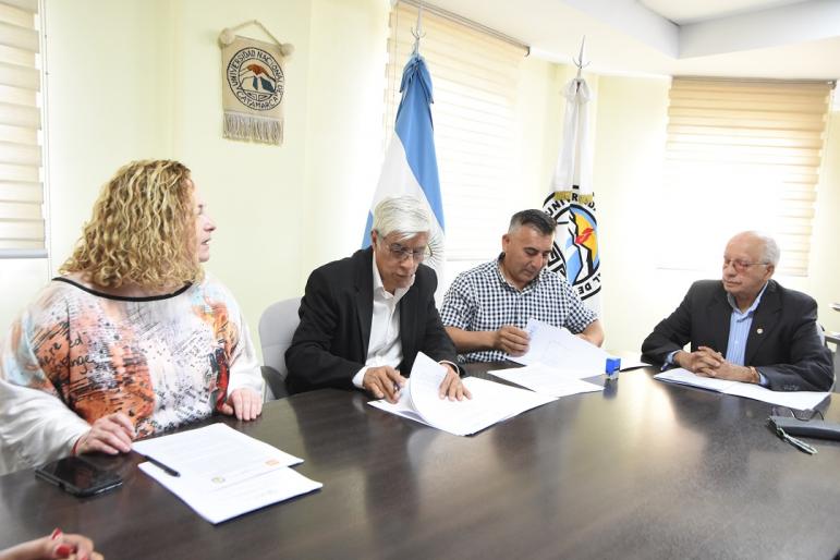Del acto de firma de convenio participaron el secretario de Extensión Universitaria, Ing. Adolfo Agüero; la secretaria de Relaciones Interinstitucionales e Internacionales, Dra. Viviana Quiroga; y el director de la Escuela de Formación Profesional y de Oficios, Ing. David Piza.
