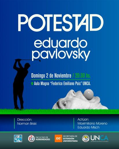 El próximo domingo 2 de noviembre a las 20,30 horas, se presentará en el Aula Magna “Federico Emiliano Pais” de la Universidad Nacional de Catamarca la obra “Potestad”, escrita por el reconocido dramaturgo Eduardo “Tato” Pavlovsky y dirigida por Norman Briski.